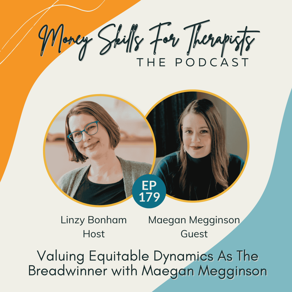 Welcome to Money Skills for Therapists, the podcast that helps therapists and health practitioners in private practice go from money confusion and shame to calm, clarity and confidence with their finances. If you’ve ever felt overwhelmed by numbers or avoided looking at your business money, you’re in the right place. I’m Linzy Bonham, therapist turned money coach and creator of Money Skills for Therapists. Before we jump in, check out my free on demand masterclass. You’ll find the link in the show notes or@moneynutsandbolts.com under masterclass. It’s the best first step to finally feeling empowered with money in your private practice. Let’s get started. Hello and welcome back to the podcast. Today’s guest is the one and only Maegan Megginson, one of my biz besties. And today Maegan and I dig into the topic of being the breadwinner, specifically being the breadwinner as a female identified person, you know, in a hetero relationship, which is our own experiences. But I share in this podcast and the reason I wanted Maegan to talk about this topic on the podcast with me is I see so many therapists in Money Skills for Therapists, my six month course for therapists in solo practice. So many therapists in that course are female breadwinners or are in queer relationship and the breadwinner in their family. And Maegan and I today talk about our own experiences with being breadwinners. She shares about the negotiations that her and her partner have done over the years to make their relationship situation work in terms of her breadwinning, him being in charge of the household. We talk about my relationship and how it looks different or similar to hers and how to have a healthy relationship when the gender dynamics are not your traditional gender dynamics. But we also talk about unhealthy breadwinning when one partner is really actually carrying the relationship and there is not balance there. And the difference between these things kind of authentic breadwinning and Kind of being left carrying all the things. Here is my conversation with Maegan Megginson. Maegan, welcome back to the podcast.